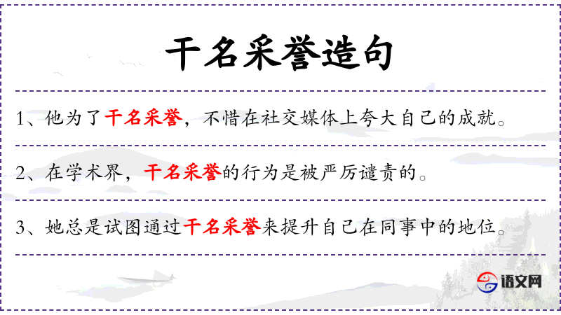 - 干名采誉:成语,意为追求名声和荣誉,通常带有贬义,指过分追求虚名。
