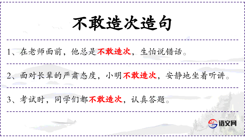 1. 【不敢造次】 造次:仓促、莽撞。指不敢匆忙地或鲁莽地从事。
