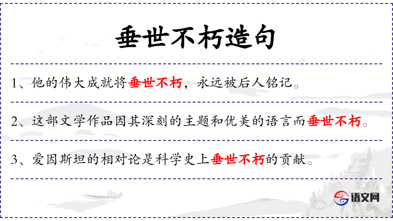 - 相关成语:“垂范后世”、“千古流芳”等,都表达了类似“垂世不朽”的含义。