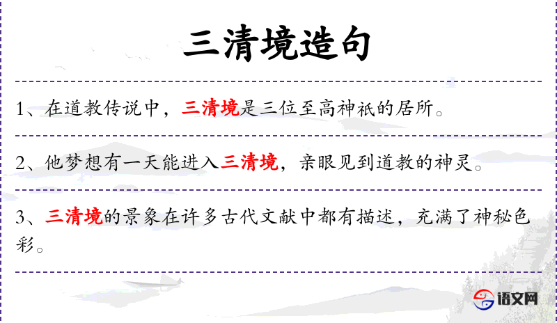 1. 【三清境】 - 道教语。指大罗天一气所化的天界,为三洞教主所居的最高仙境,即清微天玉清境,禹余天上清境,大赤天太清境。见《道教义枢》卷七。