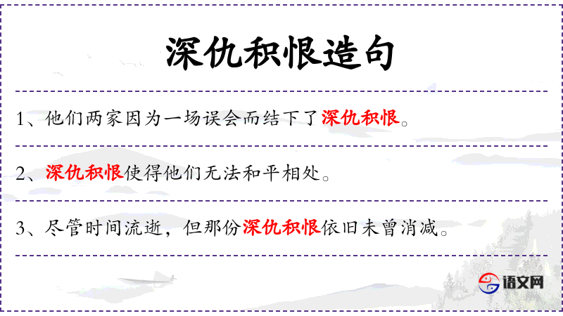 4. 【深仇积恨】 - 深而大的仇恨。形容仇恨极深。