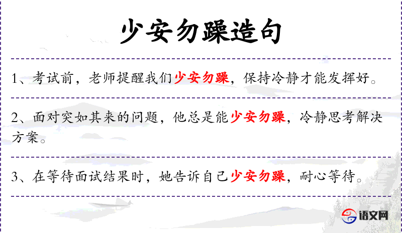 - 少安勿躁:成语,意为保持冷静,不要急躁。