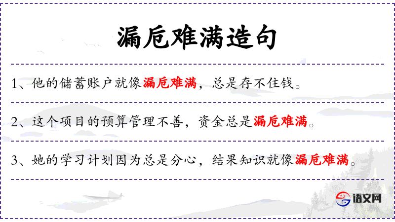 2. 【漏卮难满】 - 卮:励酒器。渗漏的酒器难于盛满。多比喻权利的外溢。