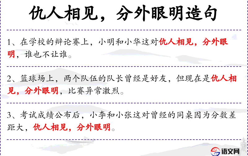 - “仇人相见,分外眼明”这个成语反映了**人对于竞争和敌对关系的描述,强调在这种情境下人们的敏感性和警觉性。