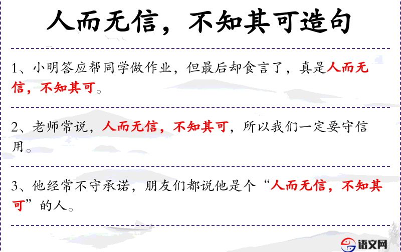 - 人而无信,不知其可:出自《论语·为政》,意为人如果不讲信用,就不知道他还能做什么。