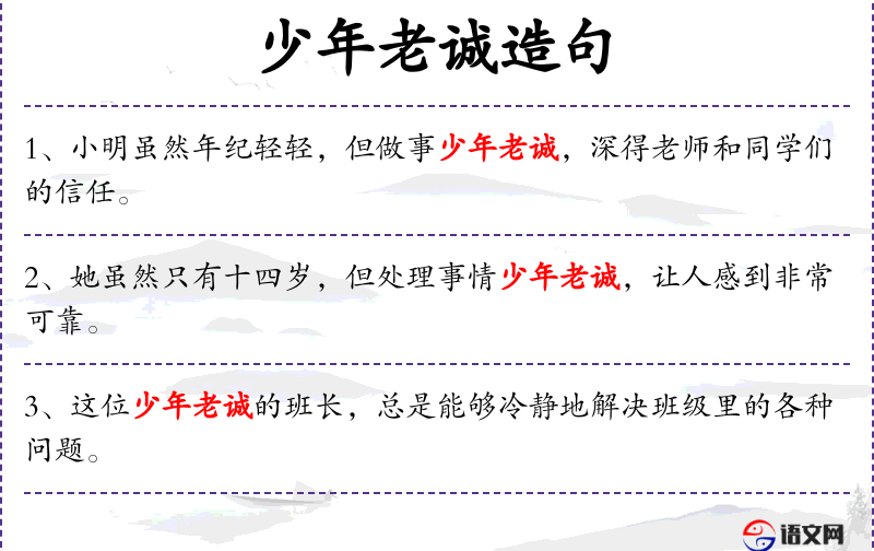 句子:“这位少年老诚的班长,总是能够冷静地解决班级里的各种问题。”