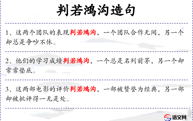 - “判若鸿沟”是一个典型的汉语成语,源自古代对地理特征的描述,后被广泛用于比喻两种事物之间的巨大差异。