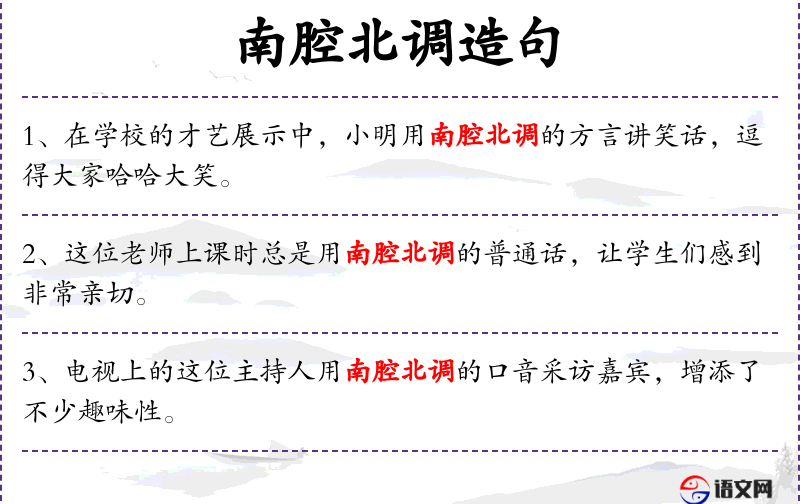 - 南腔北调:这个词组反映了**的地域文化差异,不同地区的人说普通话时可能带有各自的地方口音。