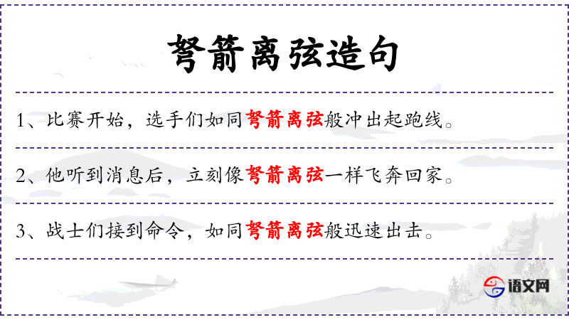 1. 【弩箭离弦】 弩:利用机械力射箭的弓。搭在弩弓上的箭射出了弓弦。形容极其迅速。