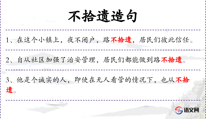 1. 【不拾遗】 - 失落的东西没有人捡为己有。形容社会风气很好。