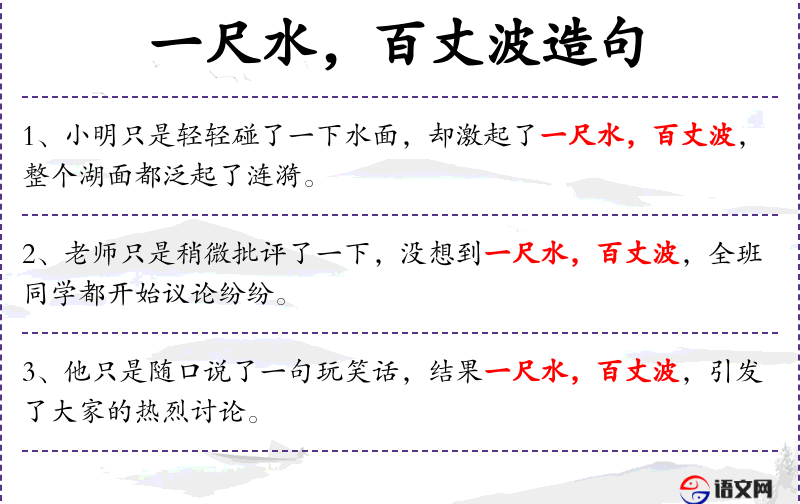 - 成语:一尺水,百丈波,源自**古代的比喻,用来形容小事情引起大反响。