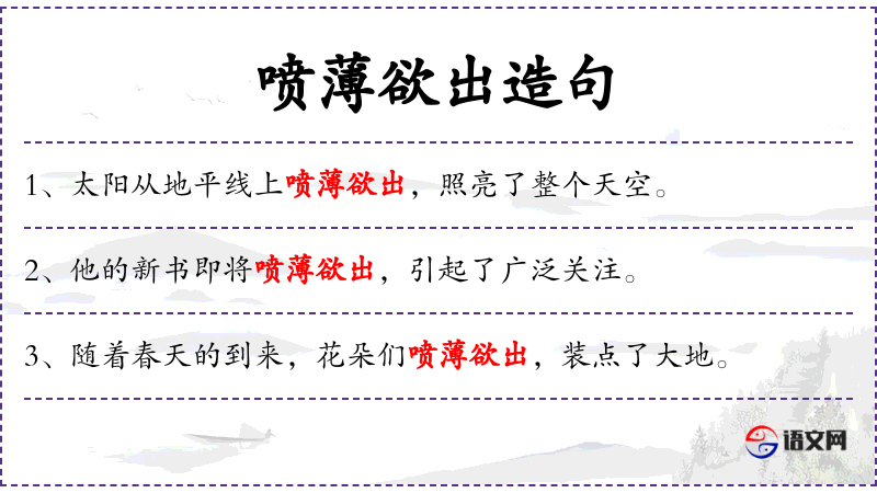 - *喷欲出**:形容太阳即将升起的壮观景象。