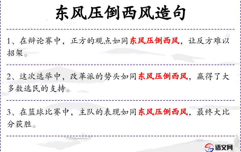 - 东风压倒西风:这是一个成语,比喻有利的形势压倒不利的形势。