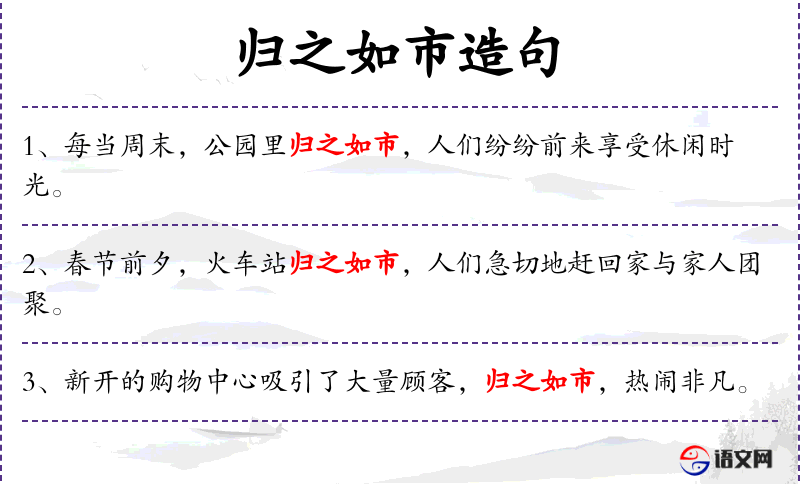 - 相关成语:“归之如市”类似于成语“人山人海”,形容人非常多。