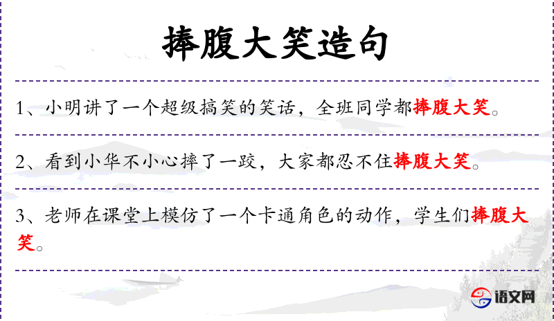 - 效果:句子的幽默效果在于小刚的意外滑倒和观众的捧腹大笑之间的对比。