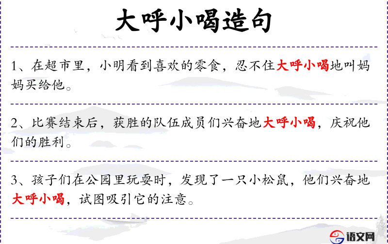 - 大呼小喝:形容词,表示大声喊叫和欢呼。