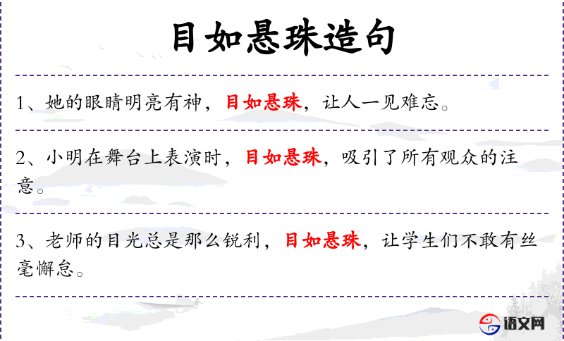 2. 【目如悬珠】 - 眼睛像一对悬挂着的珠子。形容眼睛明亮,有光彩。