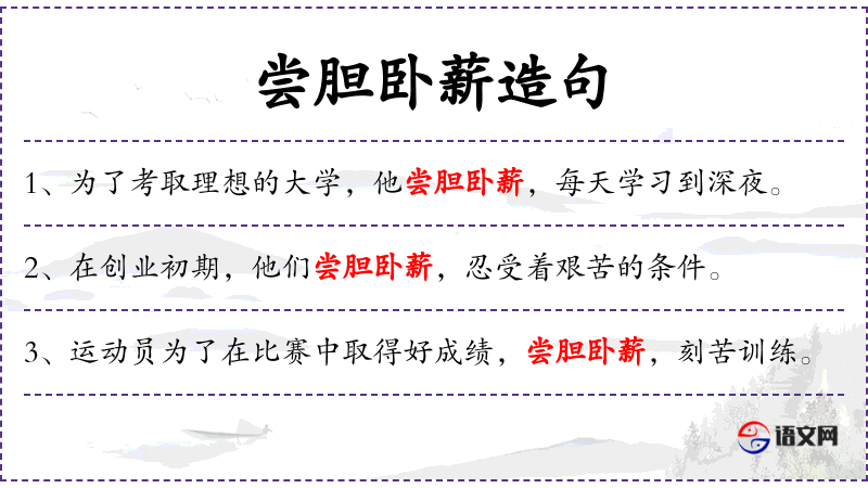 - 尝胆卧薪:这是一个成语,源自**古代历史,意为忍受极大的痛苦和困难,以激励自己不忘过去的失败,努力克服困难。