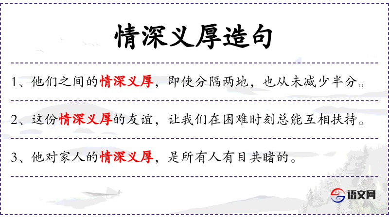 - 情深义厚:形容人与人之间的感情深厚,义气浓重。