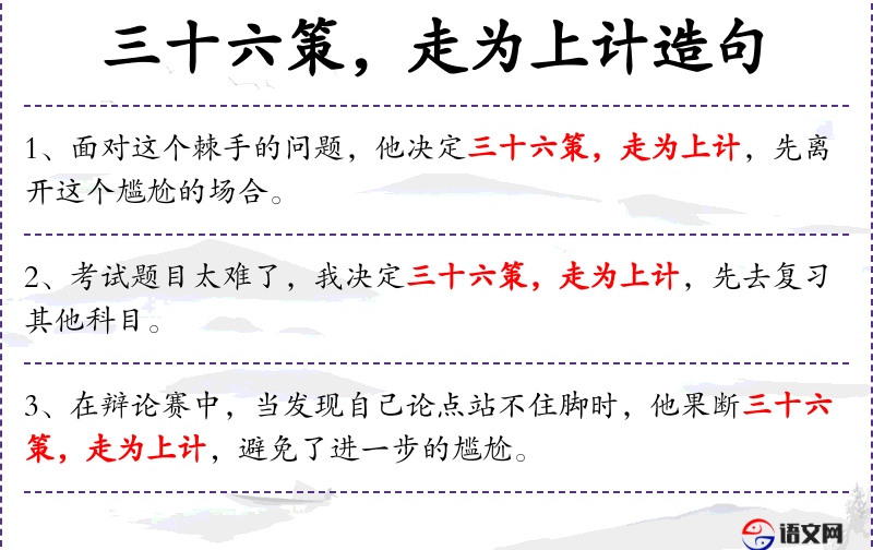 句子中的“三十六策,走为上计”是**传统文化中的成语,源自古代兵法。这个成语在这里被用来比喻在面对困难时,选择暂时逃避可能是一种明智的策略。