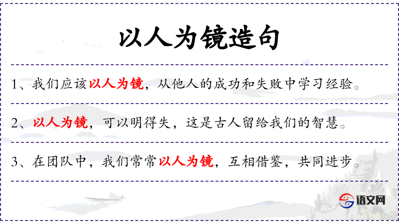 - 以人为镜:比喻通过观察他人来了解自己的优点和缺点。