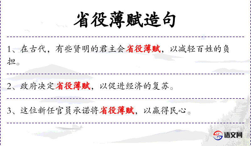1. 【省役薄赋】 - 减轻徭役和赋税。指施行仁政。
