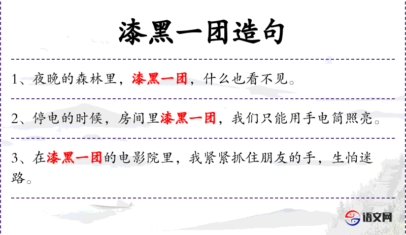 5. 【漆黑一团】 - 形容一片黑暗,没有一点光明。也形容对事情一无所知。