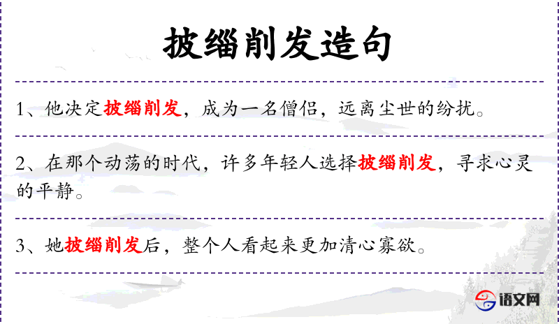- 英文:He shaved his head and donned the monastic robe to escape the pain of reality and seek inner peace.