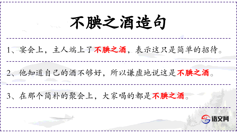 1. 【不腆之酒】 - 不腆:不丰厚。自谦之词,意思是不丰盛的酒席。