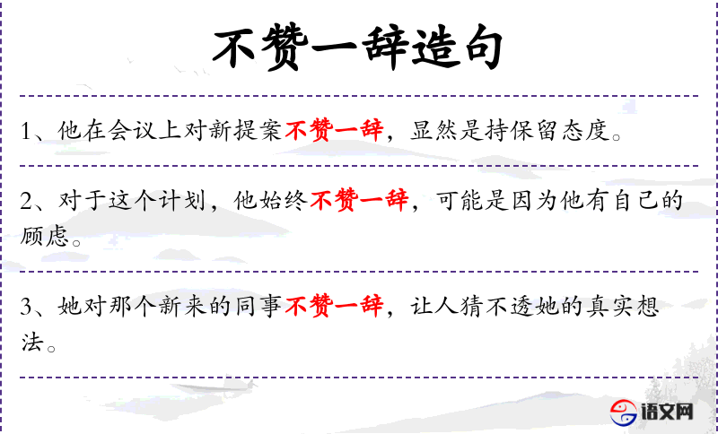 1. 【不赞一辞】 原指文章写得好,别人不能再添一句话。一句话也不说。