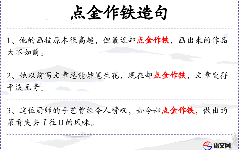 4. 【点金作铁】 - 用以比喻把好文章改坏。也比喻把好事办坏。同“点金成铁”。