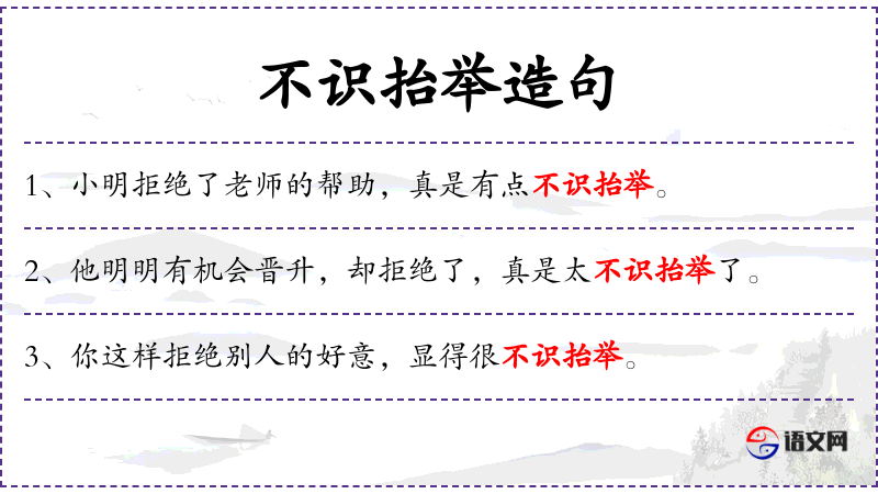 1. 【不识抬举】 - 识:认识,理解;抬举:赞扬,器重。不懂得人家对自己的好意。