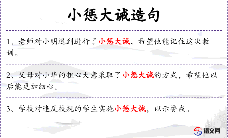 - 小惩大诫:这个成语源自**传统文化,强调通过小的惩罚来达到大的教育效果。