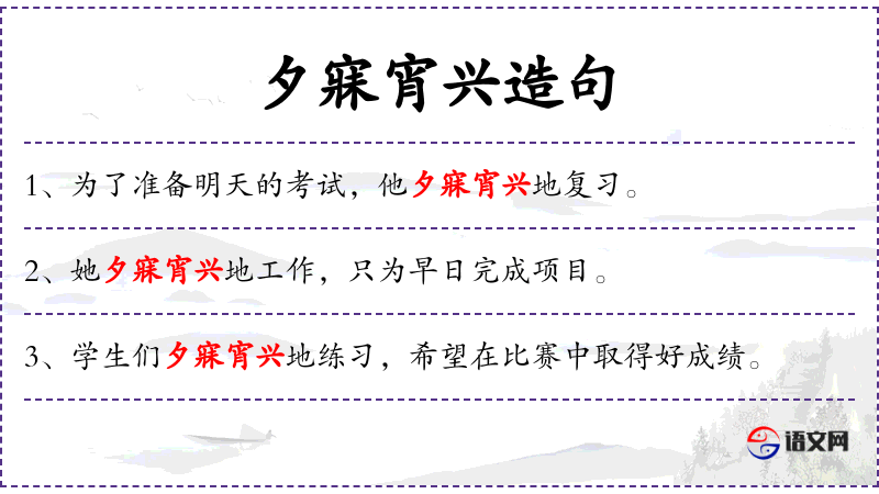 - 夕寐宵兴:成语,形容夜以继日地工作,非常勤奋。