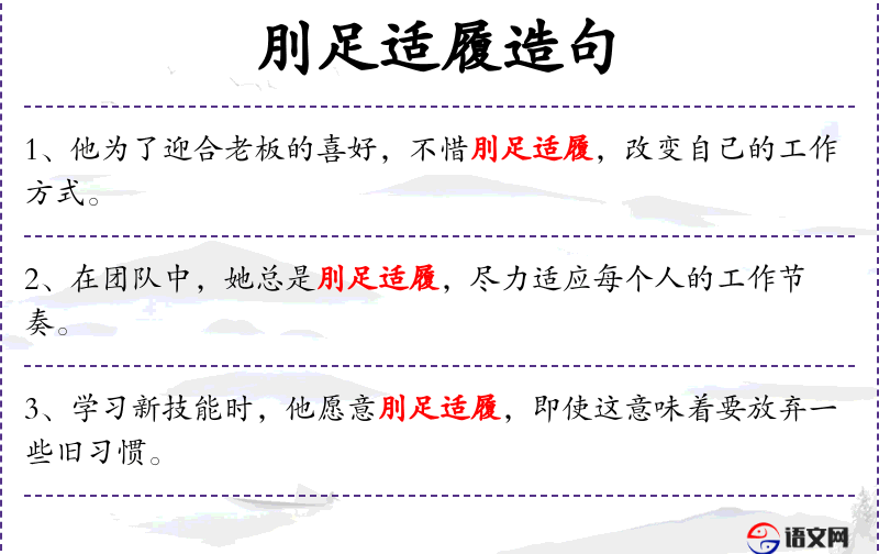 - 刖足适履:这个成语源自**古代,原意是指为了穿上合适的鞋子而削足,比喻为了适应新情况而做出极端的改变。