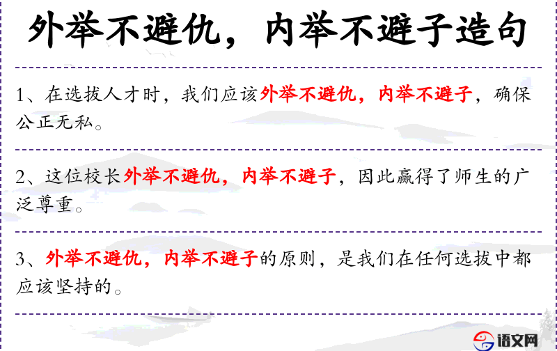 - 外举不避仇:指在选拔人才时,不因为与被选拔者有仇恨而排斥他。