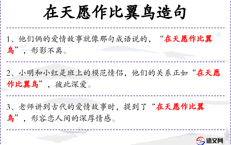 - 在天愿作比翼鸟:这个成语源自白居易的《长恨歌》,原文是“在天愿作比翼鸟,在地愿为连理枝”,比喻夫妻恩爱,形影不离。