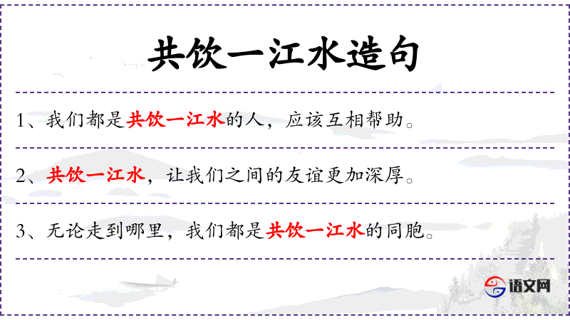- 共饮一江水:这个短语字面意思是“一起喝同一条江的水”,通常用来比喻共同经历或共享资源,强调团结和共同体的感觉。
