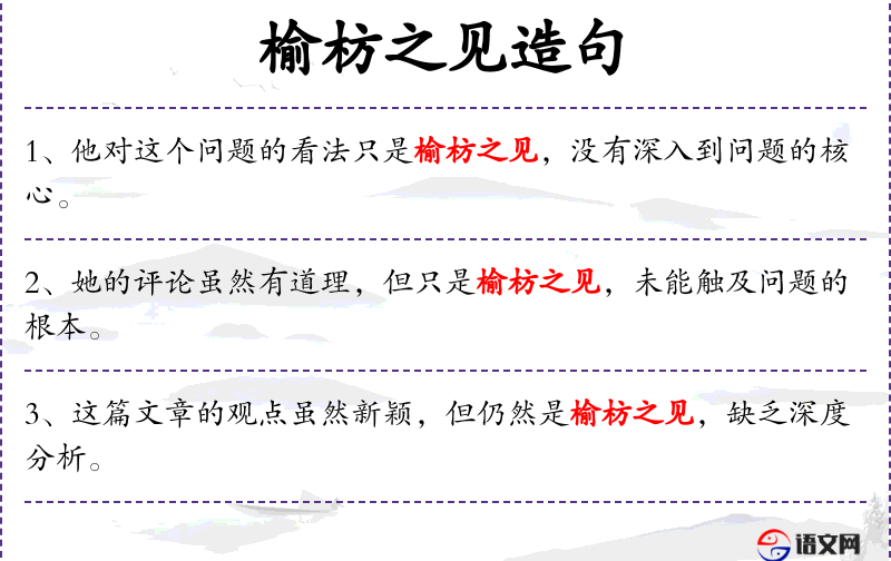 4. 【榆枋之见】 榆枋,榆树与枋树。比喻狭小的天地。后用以比喻浅薄的见解。