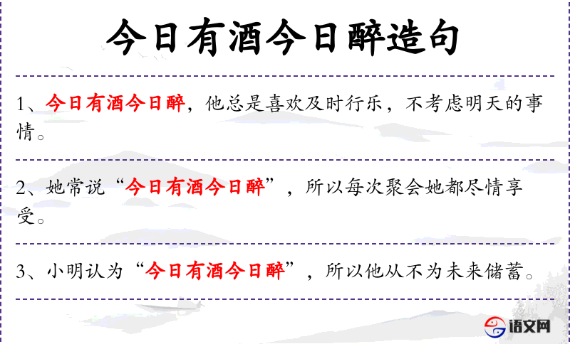 - 今日有酒今日醉:成语,意思是及时行乐,享受当下。