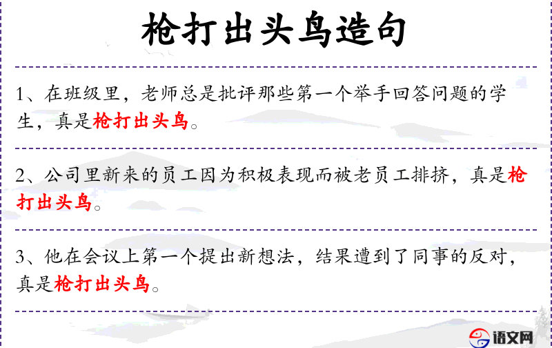 1. 【枪打出头鸟】 - 出头鸟:飞在鸟群前面或把头先从窝里伸出来的鸟,比喻表现突出或领头的人。比喻冒尖的人容易遭殃。