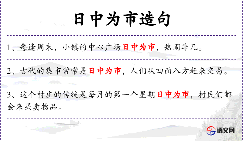 4. 【日中为市】 日中:太阳当头,指正午;市:做买卖。中午进行交易做生意。原指古代物物交换的集市方式。后也形容偏僻地区的商业活动情形。