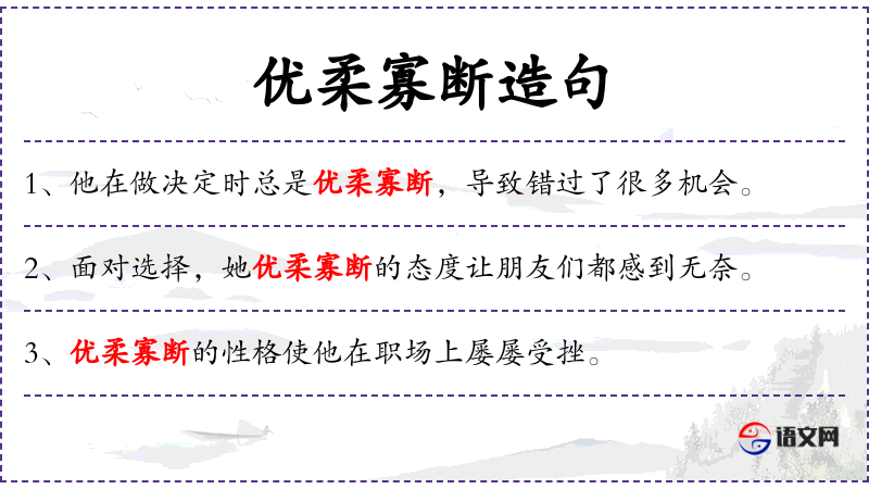 - 优柔寡断:形容词,形容一个人在做决定时犹豫不决。