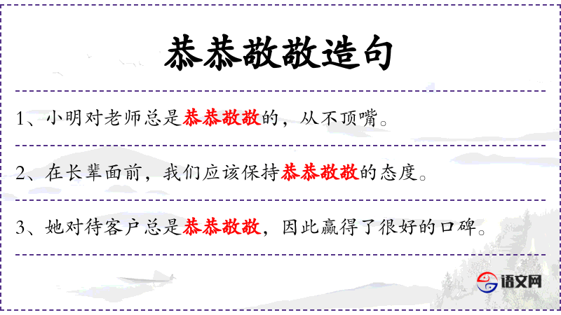 - 恭恭敬敬:形容词,表示尊敬的态度。