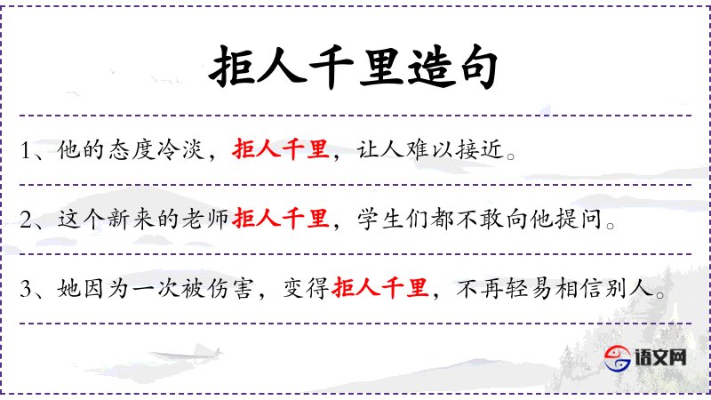 - 宾语:无明确宾语,但“拒人千里”隐含了宾语“顾客”