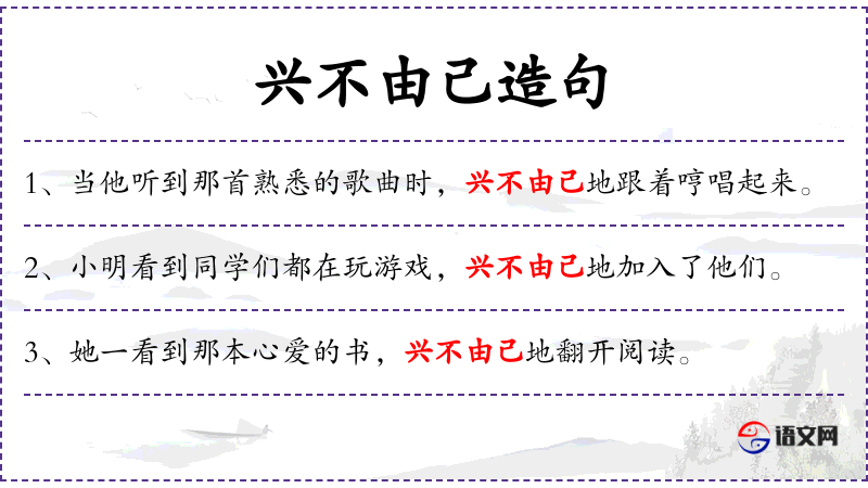 - 状语:当他听到那首熟悉的歌曲时、兴不由己地