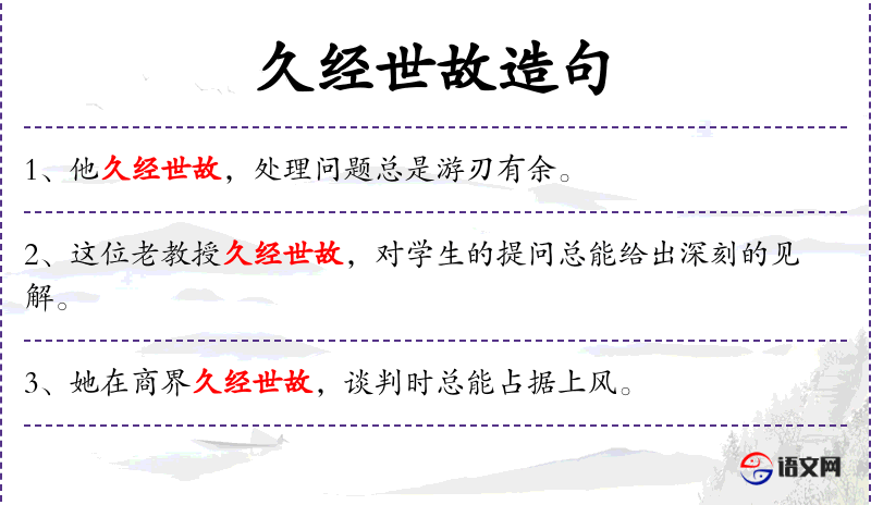- 久经世故:形容人经验丰富,处事老练。