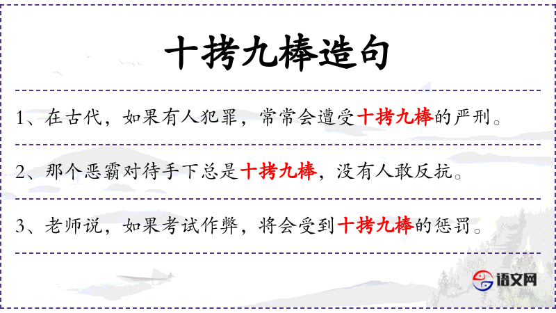 - 十拷九棒:形容严厉的惩罚,拷打和棒打。