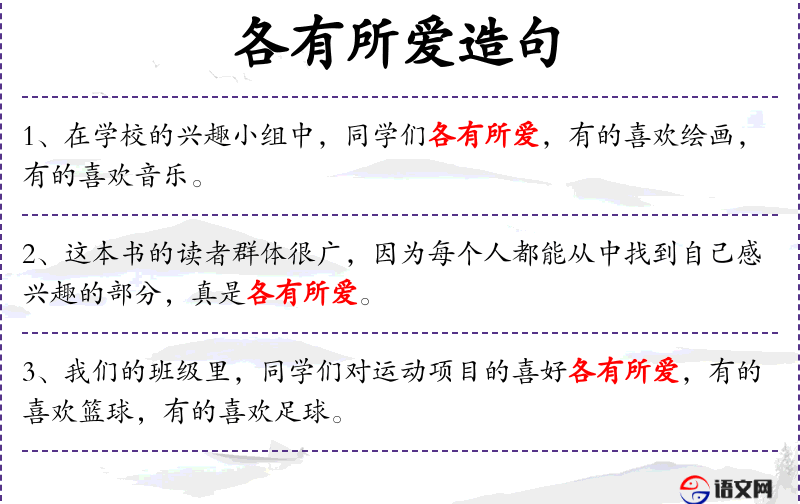 句子:“我们的班级里,同学们对**项目的喜好各有所爱,有的喜欢篮球,有的喜欢足球。”