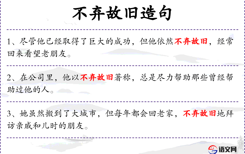 1. 【不弃故旧】 弃:抛弃;故旧:旧交。不轻易抛弃老朋友。